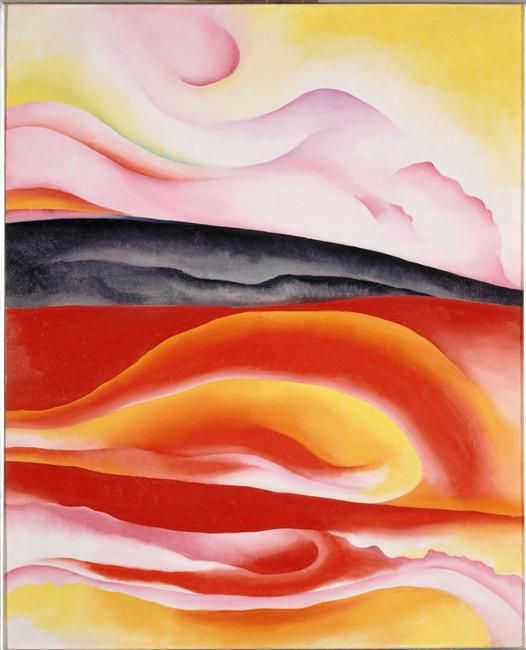 If we juxtapose the first painting with Red, yellow and black streak published in 1924, it is not immediately clear that it depicts the same place. However, it is ! The difference is the point of view and the feelings that O’Keefe had when she painted. Maybe O’Keefe felt happy and was in love when she painted it. The choices of the colours and shapes are very well chosen (cloud shapes, bright and warm colours…).
