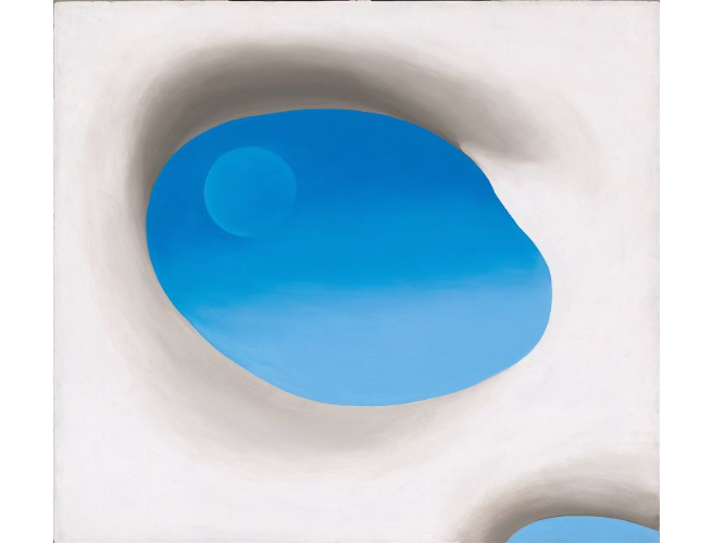 Pelvis IV is a canvas in oil paint made in 1944. It depicts an extreme close-up view of the socket of a pelvic bone. The whiteness of the bone is filling the three corners of the frame. We can also perceive a bit of another hole in the right-hand bottom corner. Through the main hole opening, we can see a blue sky with a pale and transparent moon (that is almost full) in the upper left corner. A touch of blue is also in the lower right corner where the bone curves in. We chose this painting because it’s very relaxing and beautiful.