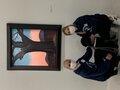 Nina was surprised by this piece because she thought there were little lights in the frames, but it was just the painting. Nina’s dream is to drink a cup of tea, in her conservatory, in front of this painting on a foggy day. The way the light reflects off the painting reminds her of stained glass. It also reminds us of the book Lord of the Flies, especially of the character Jack, because the shapes seem to be very fluid and erratic, and the colours are dark and deep.